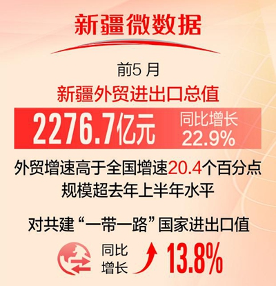 前5月,新疆外貿進出口總值2276.7億元,同比增長22.9%,外貿增速高於全國增速20.4個百分點,規模已超去年上半年水平。