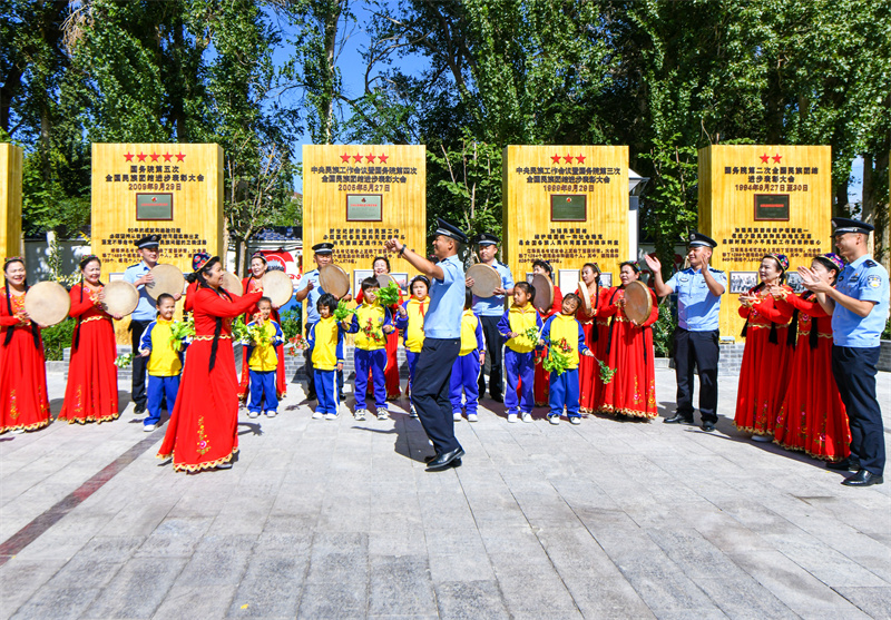 7月28日,何春明(右一)在“牢記囑托 感恩奮進——2025行走的思政課”系列主題活動烏魯木齊市天山區固原巷社區專場活動中,分享下馬崖邊境派出所戍邊為民的故事。人民網 李欣洋攝