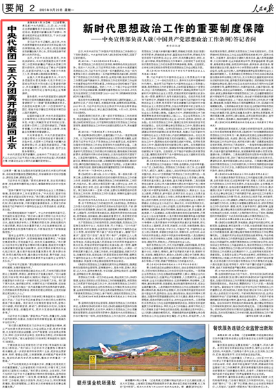 本報北京9月28日電 (記者宦翔、蔣雲龍)中央代表團二、三、四、五、六分團在出席新疆維吾爾自治區成立70周年慶祝活動、看望慰問新疆各族干部群眾、考察當地經濟社會發展情況后,於28日從新疆乘機返回北京。