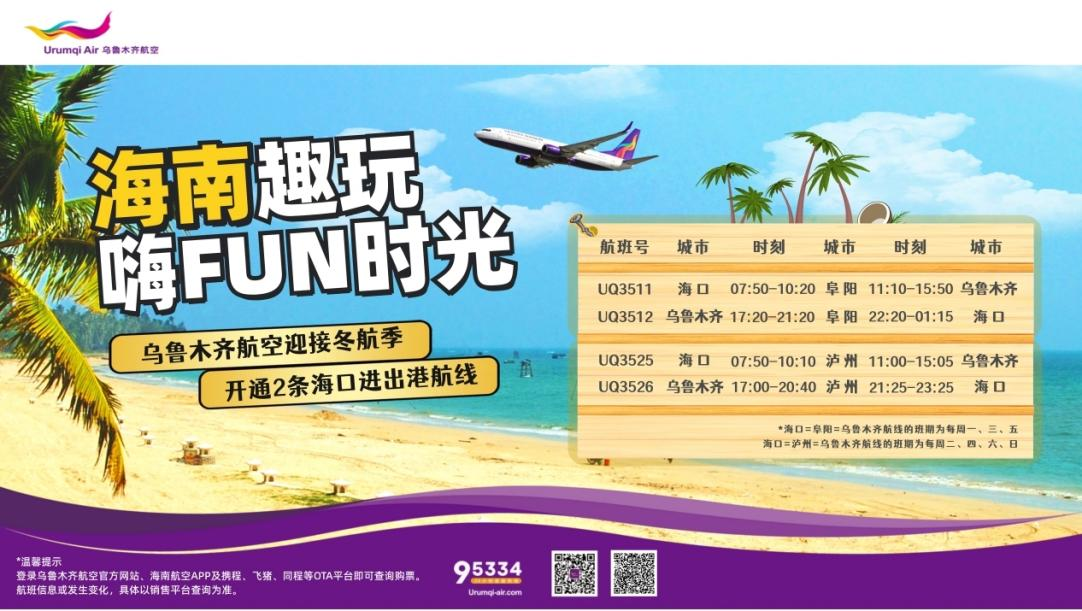 打造“暖冬+冰雪”新體驗!烏魯木齊航空冬航季新開2條海口進出港航線!