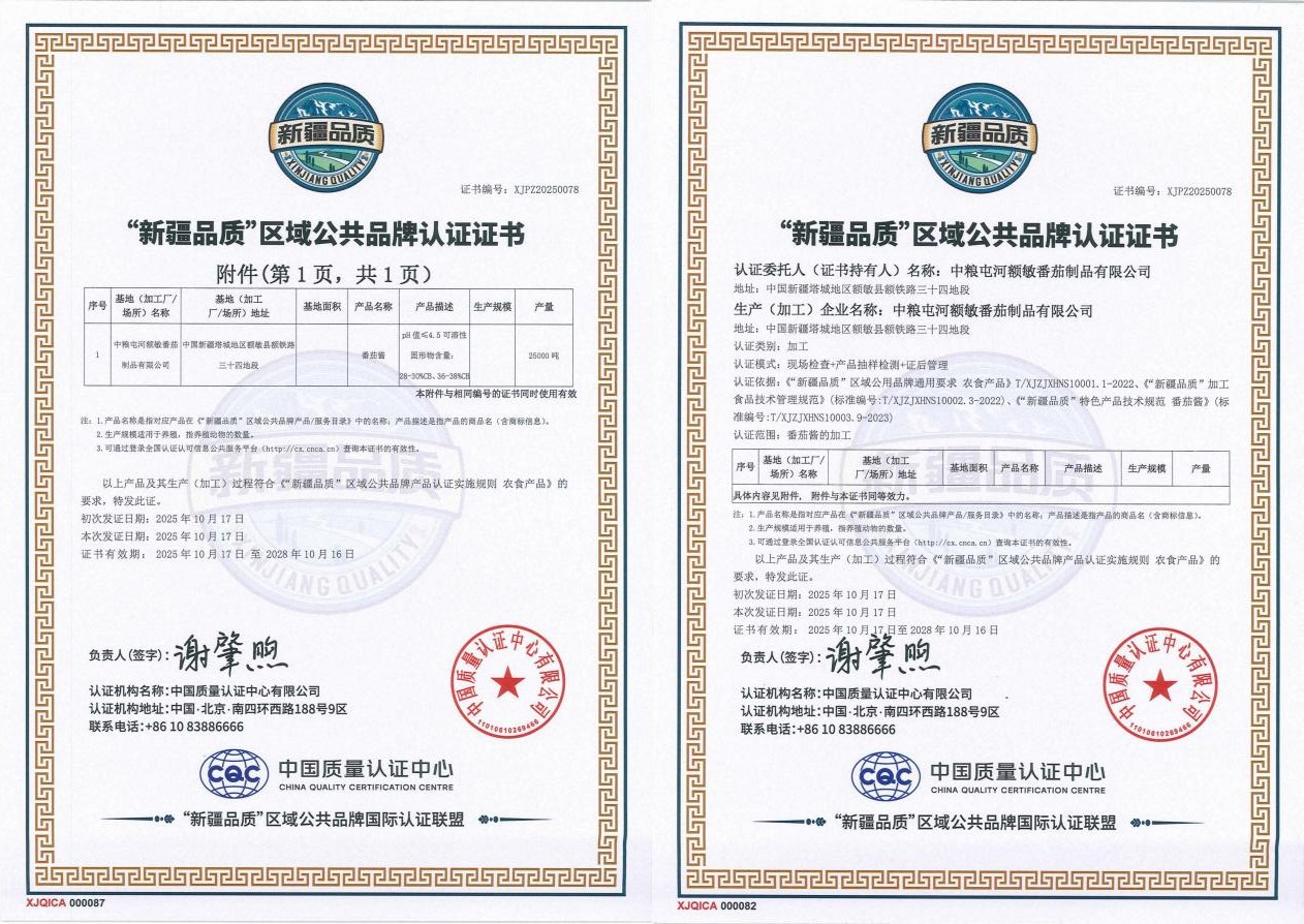 中糧屯河額敏番茄制品有限公司負責人表示:“此次獲得‘新疆品質’認証,是對我們產品質量和管理水平的充分肯定。我們將始終堅持質量為先、誠信經營的理念,持續提升生產技術和工藝水平,嚴控從原料到成品的每一個環節,為全球消費者提供安全、優質、營養的番茄制品,擦亮‘新疆品質’金字招牌。”