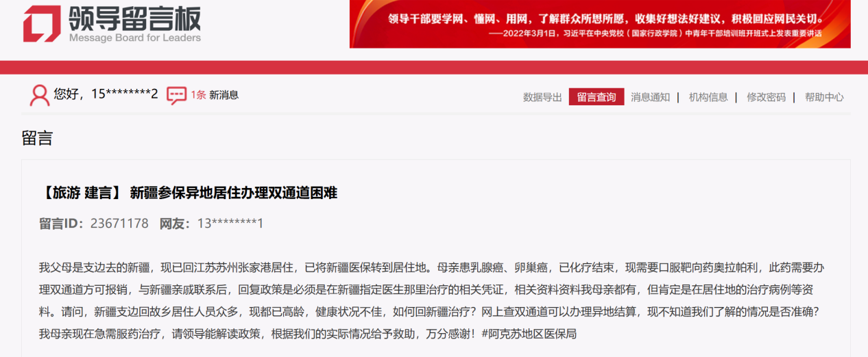 “我的母親是一名支疆返鄉人員,近期母親在化療結束后,需要服用靶向藥奧拉帕利,但咨詢后此藥需要辦理‘雙通道(雙通道特藥備案表)’,並且要求提供‘疆內指定醫院治療憑証’才能報銷,母親年歲已大,不適合返回新疆治療。”江蘇網友表示,“留言后,醫保局工作人員進行了電話指導,協助我們按照流程進行了填報,一周后報銷費用就到賬了。”