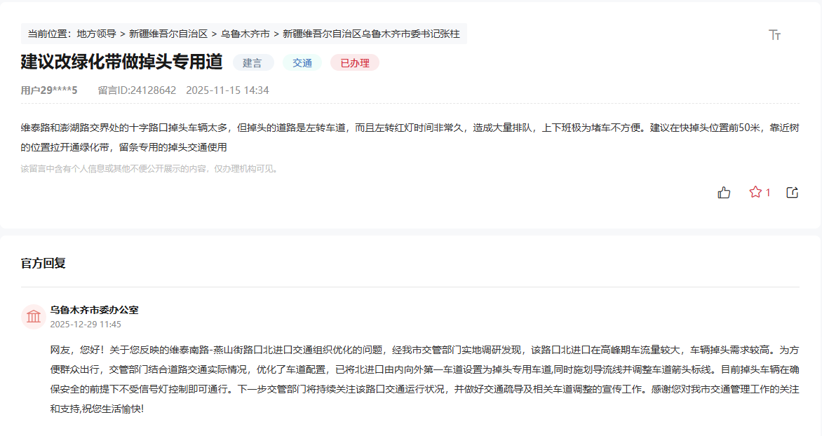 烏魯木齊市委辦公室接到留言后,立即協調交管部門處理,回復表示:已將該路口北進口由內向外第一車道設為掉頭專用道,同時施劃導流線並調整車道箭頭標線,車輛可不受信號燈控制通行。后續將持續關注路口通行狀況,動態優化交通組織。