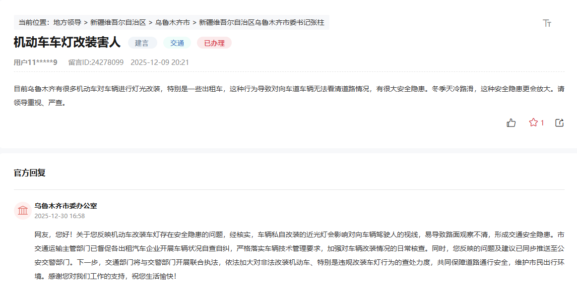 還有網友反映當地不少機動車尤其是出租車存在私自改裝車燈的情況,強光影響對向車輛視線,存在交通安全隱患。烏魯木齊市委辦公室回復:已督促轄區出租車企業開展自查自糾,同時將相關問題推送至交警部門,下一步交通與交警部門將開展聯合執法行動,加大對非法改裝車燈行為的查處力度,保障道路通行安全。