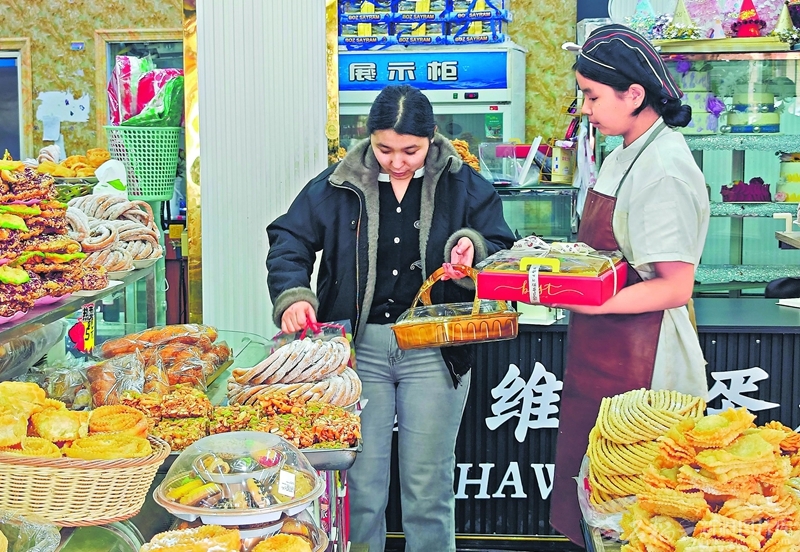 各地州市消費市場同樣火爆。巴楚縣各大商超備足貨源,干果、糕點熱銷。在該縣某甜品店內,各式干果、糕點、糖果擺滿貨架,吸引了不少群眾駐足選購。“今天專程來這裡挑些糕點,准備過節時招待親朋好友。”當地居民夏依達·肉孜說。