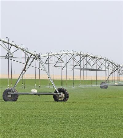 從高空俯瞰,圓形麥田似鐘表的表盤,長長的噴灌機猶如指針,以支座為軸緩慢地做勻速圓周運動。