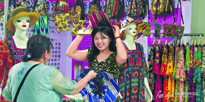 8月19日,观众在喀交会“丝路非遗·魅力喀什”展区选购用艾德莱斯绸制作的遮阳帽。石榴云/新疆日报记者约提克尔·尼加提摄