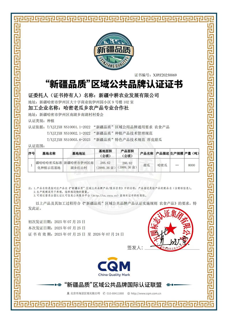 近日,位于哈密市的新疆中耕农业发展有限公司委托哈密老瓜乡农产品专业合作社种植的哈密瓜成功通过认证,成为“新疆品质”品牌体系的新成员,标志着该企业哈密瓜在品质管控与地域特色彰显上达到自治区级标杆水平。