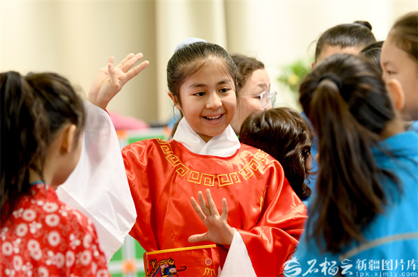 12月3日,精河第一小学学生在校京剧社团学习京剧。