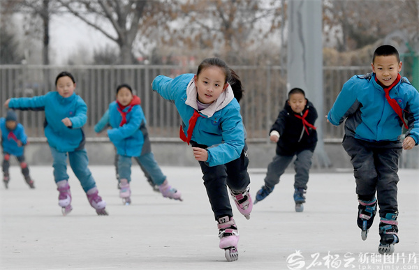 12月3日,精河第一小学学生在校轮滑社团学习轮滑。