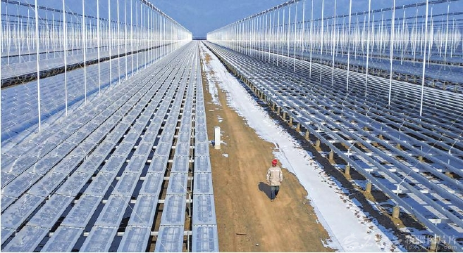 1月12日,工作人员在位于哈密市伊州区的大唐石城子100万千瓦“光热+光伏”一体化清洁能源示范项目现场巡查。目前,该项目90万千瓦光伏部分已并网发电,10万千瓦光热部分进入攻坚阶段,不久将实现全面投产。石榴云/新疆日报记者蔡增乐摄