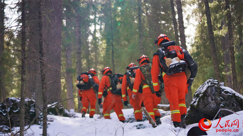 徒步穿行山林间,积雪深且松软,巡护队员们细致勘察林区态势、逐项检查消防应急点位物资储备情况,对存在安全隐患的枯木、倒木进行清理修剪。