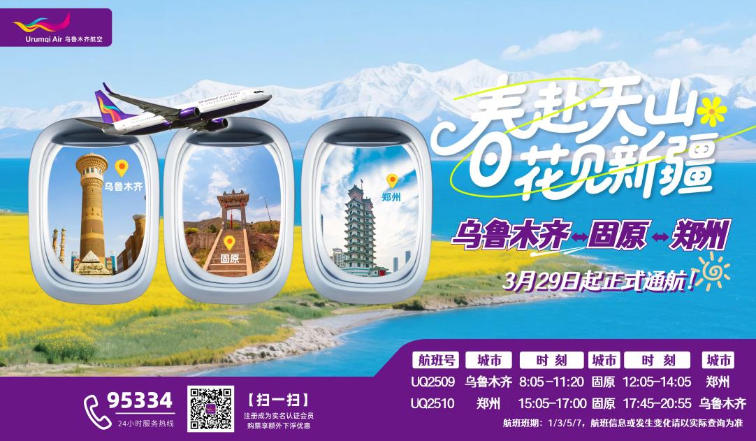 收藏3月29日起,全国民航正式进入2026年夏航季。为契合新航季市场出行需求,新海航航空集团旗下乌鲁木齐航空计划于换季首日(3月29日)起全新开通乌鲁木齐=固原=郑州航线,搭建新疆、宁夏与中原地区互联互通的高效空中桥梁,为三地文旅融合、经贸往来及民生出行注入全新航空动能。
