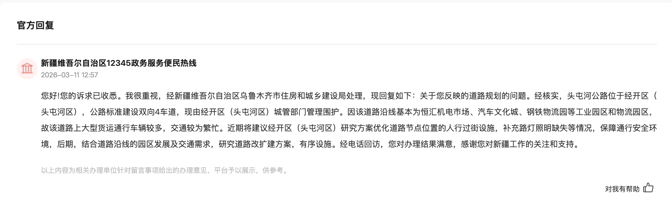 另一位市民留言反映,乌鲁木齐市头屯河公路(三十公顷公交站至天恒基汽车城段)为双向四车道,未设置辅道、非机动车道及人行道,随着沿线及周边区域发展,人流、车流量持续增长,存在交通拥堵严重、人车混行安全隐患大、道路功能不全等问题,建议将该路段升级改造纳入重点规划,拓宽为双向六车道,并同步建设独立辅道、非机动车道和人行道。