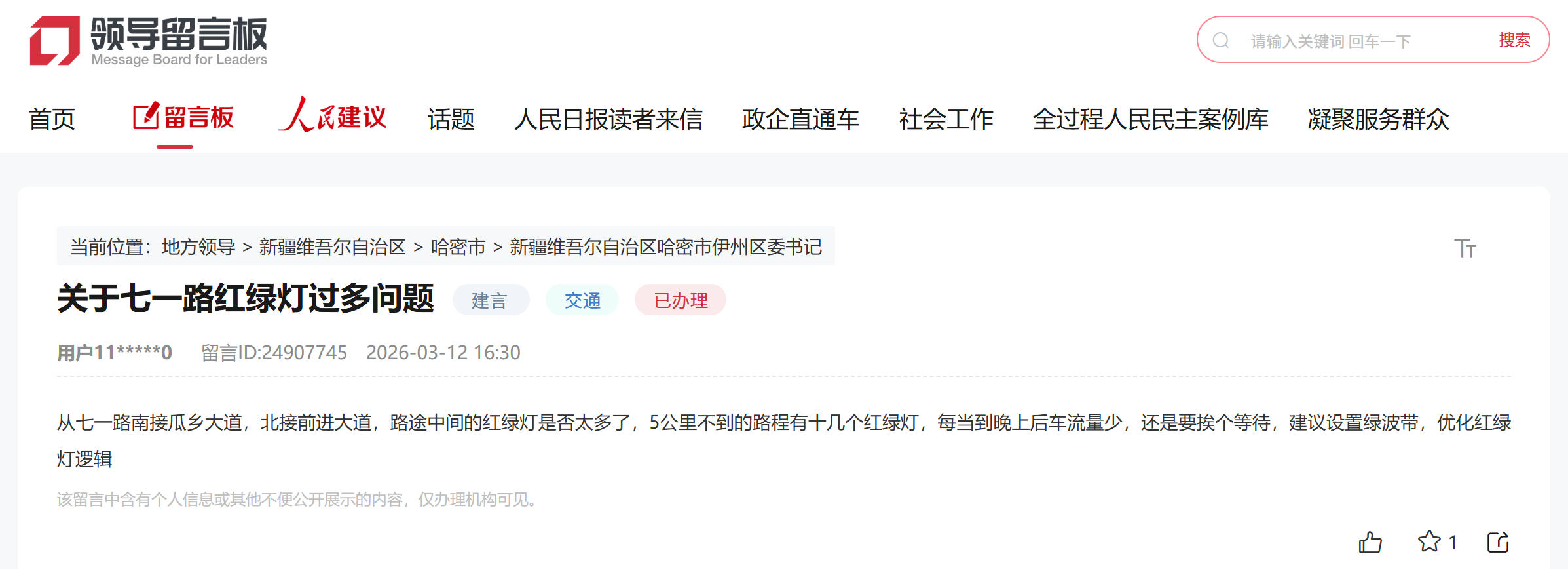 收到留言后,哈密市伊州区高度重视。3月19日,伊州区在回复中表示,经核查,该路段为城区重要纵向通道,沿线路口密集,信号灯设置以保障安全与秩序为前提。针对群众反映的夜间“空等”问题,当地计划通过现场踏勘与流量监测,进一步核实夜间车流特征,对车流量小、等待时间长的路口,缩短夜间信号周期、优化空放时长,减少无效等待。